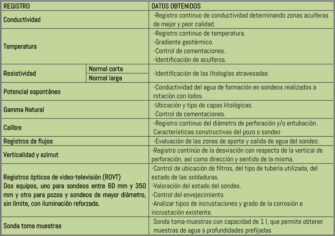 Los “logs”o registros que se obtienen, son continuos a lo largo de la totalidad de la columna del sondeo. En el cuadro adjunto se describen los principales objetivos que se cubren en testificación geofísica aplicada a pozos y sondeos.